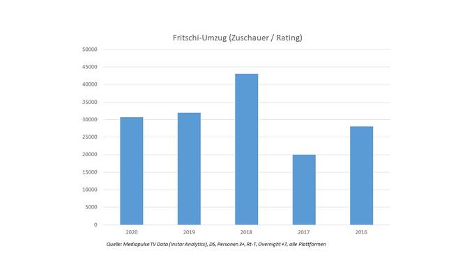 Die Live-Produktionen an der Fasnacht 2020 haben dem Zentralschweizer Fernsehen Tele 1 erfreuliche Zuschauerzahlen beschert. Total wurden am Schmutzigen Donnerstag und am Güdisdienstag 425'000 Personen erreicht. Den Fritschi-Umzug am Schmutzigen Donnerstag schauten durchschnittlich rund 31'000 Personen, das Monstercorso sogar über 61'000 Personen.