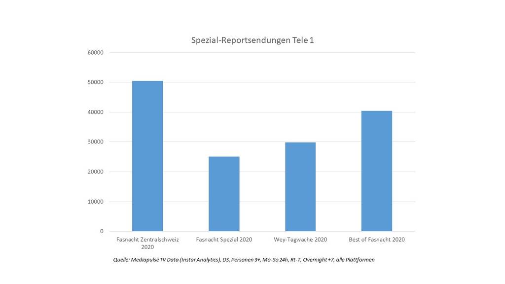 Auch die verschiedenen Spezialreports haben hohe Zuschauerzahlen verzeichnet. Insgesamt erreichte Tele 1 mit den vier Spezial-Fasnachtreports inkl. Wiederholungen rund 145'000 Personen.