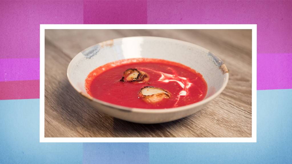 Die Vorspeise: Randen-Suppe mit Jakobsmuscheln