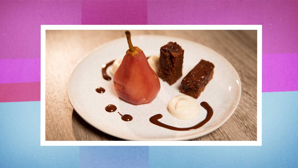 Das Dessert: Schokoladenschnitte mit weisser Schokoladencrème, Tonkabohnen und Williams-Birnen
